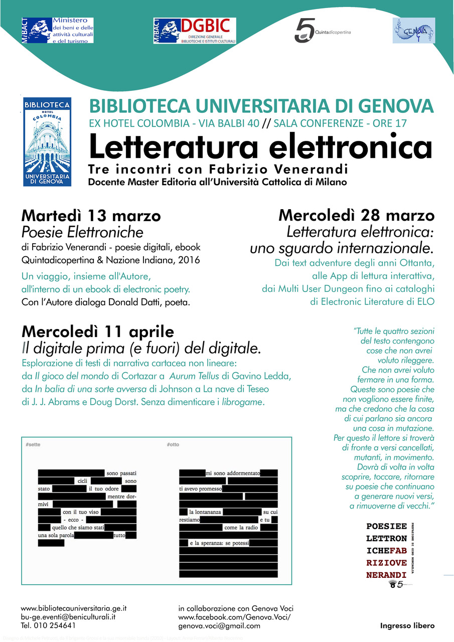 Fabrizio Venerandi, autore dell’ebook Poesie Elettroniche coedito da Nazione Indiana, terrà a Genova tre incontri a ingresso libero sul tema della letteratura elettronica. Accorri numeroso! – Jan Reister